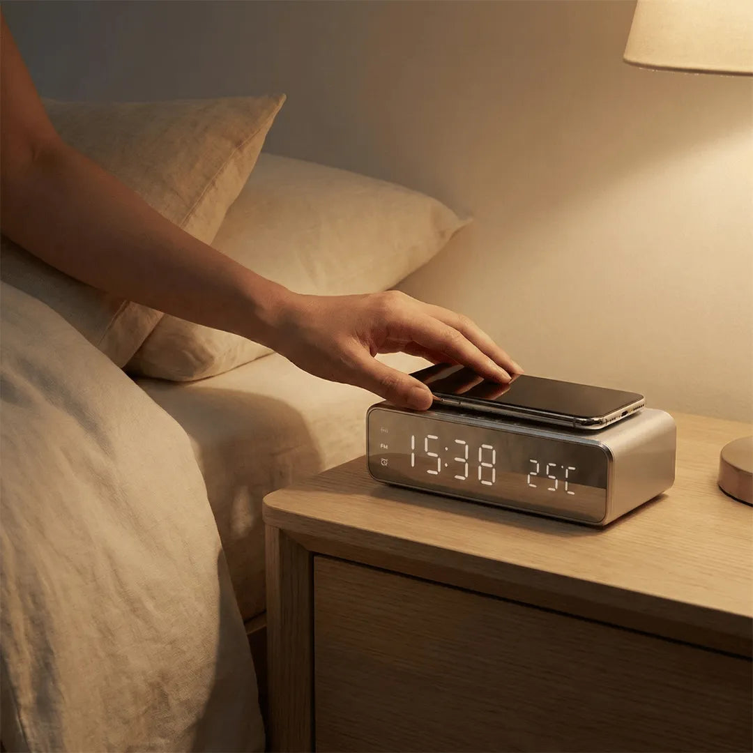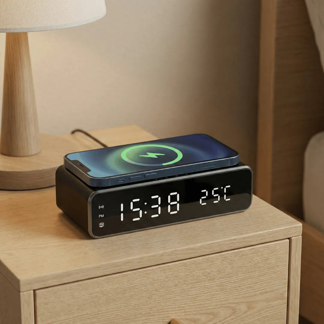Posez simplement votre téléphone sur le réveil : la charge démarre automatiquement, l’heure reste visible, l’alarme est prête. Le soir devient plus simple. Le matin commence sans friction.